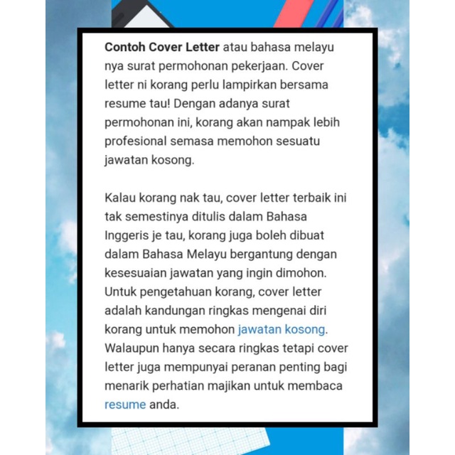 Contoh surat cover letter dalam bahasa melayu dan bahasa inggeris untuk permohonan pekerjaan dihantar dengan cv atau resume melalui emel.